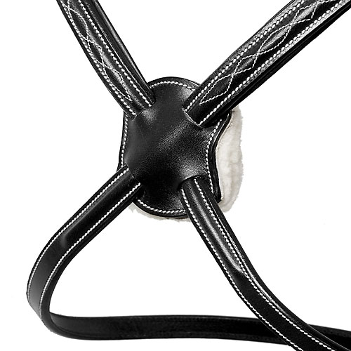 Cabezada para filete. No incluye riendas. Cabezada con muserola cruzada tipo mejicana con borreguillo natural. Testera acolchada con montantes por el interior para mayor confort del caballo. Realizada íntegramente con cuero vegetal de primera calidad procedente de USA y curtido de forma ECOLÓGICA también en USA. Hebillaje de latón.