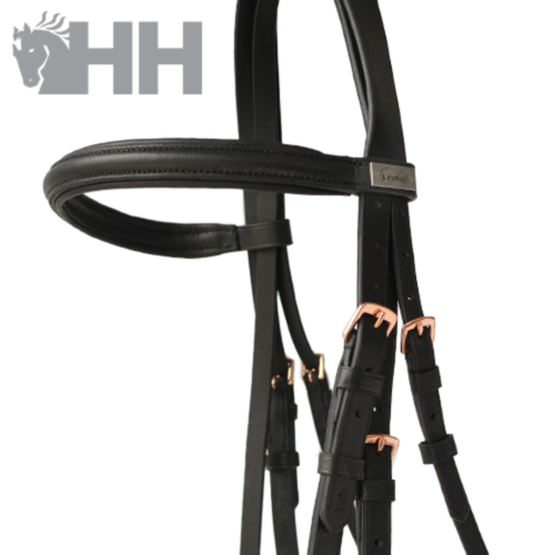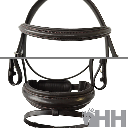 Cabezada para filete con un solo montante y realizada con cuero de primera calidad y hebillaje de acero inoxidable. Muserola acolchada extra ancha (5 cm de anchura en la parte interior) y cierrabocas. Cierre de la muserola de dos piezas con acolchado y correa para tensar.