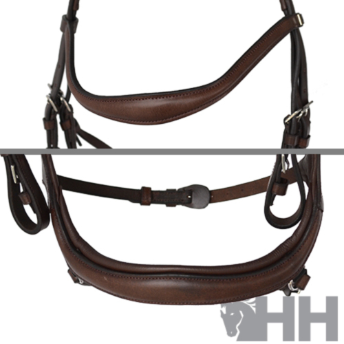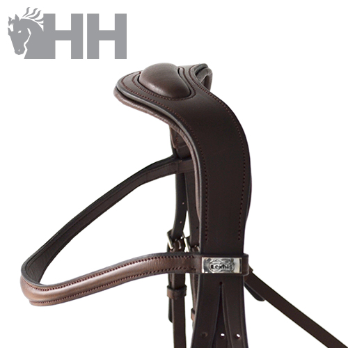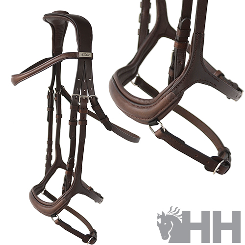 Cabezada de competición de diseño actual con la testera, frontalera y muserola anatómica. La testera, además de su diseño anatómico, está muy acolchada para ofrecer un confort superior a la nuca del caballo. La muserola, también anatómica, está diseñada para apoyar en los huesos de la cabeza del caballo y al igual que la testera ofrecer el máximo confort al caballo. Se suministra con riendas de goma con tacos.