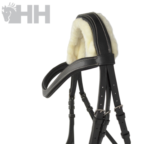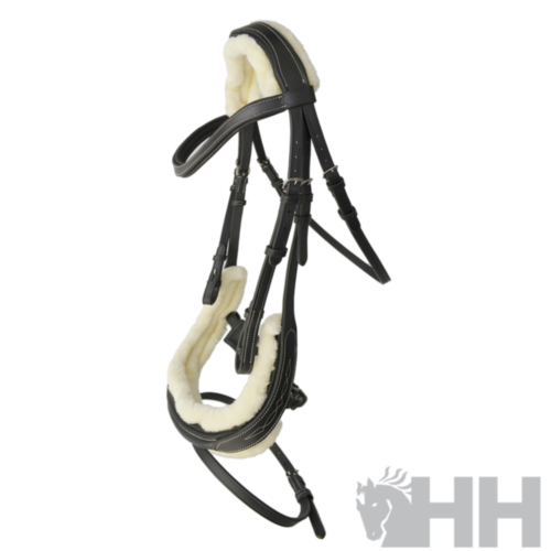 Cabezada de cuero natural de primera calidad con refuerzos de suave borreguillo sintético. Muserola anatómica y riendas de lona con tacos.
