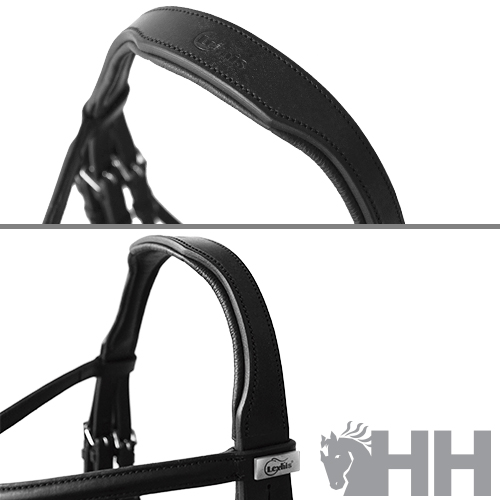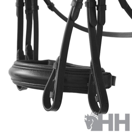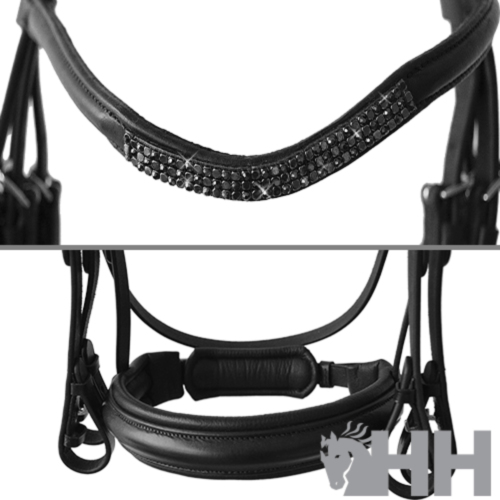 Cabezada para filete y bocado realizada con cuero de primera calidad y hebillaje de acero inoxidable. Muserola acolchada extra ancha (5 cm de anchura en la parte interior) y testera anatómica acolchada. Elegante frontalera decorada con una discreta banda de cristales. Cierre de la muserola de dos piezas con acolchado y correa para tensar.