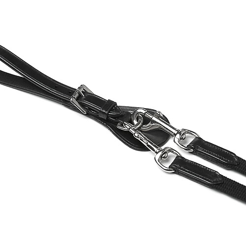 Realizada con cuero vegetal de primera calidad procedente de USA y curtido de forma ECOLÓGICA también en USA. Sistema de enganche a la cincha independiente para poder montar y desmontar sin necesidad de soltar la cincha. Las riendas se componen de dos tipos de lona muy diferenciada, la zona a las manos del jinete está compuesta por una lona engomada muy resistente y con bastante agarre o grip, mientras que la parte inferior al contacto con el caballo está realizada con una lona muy suave pero resistente para evitar rozaduras con la piel del animal.