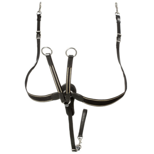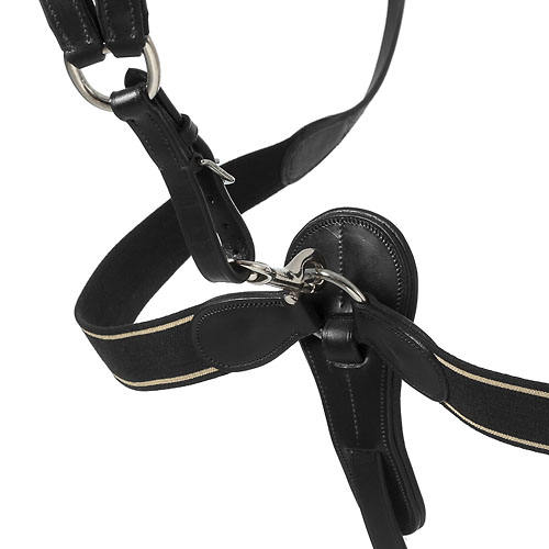 Pechopetral inglés cruzado con elásticos realizado con goma suave muy resistente. El conjunto lleva unas medias tijerillas desmontables también elásticas. El cuero utilizado es cuero vegetal de primera calidad procedente de USA y curtido de forma ECOLÓGICA también en USA. Posibilidad de hebillaje dorado ó inoxidable.