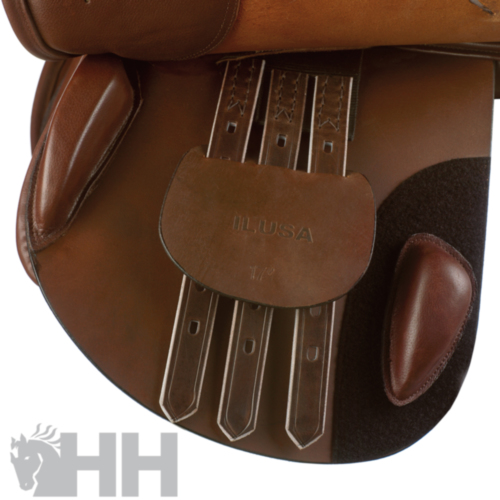 Silla de salto con asiento plano y caja cuadrada con una excelente relación calidad/precio. 2 años de garantía sobre la armadura. Incorpora tacos delanteros y traseros movibles con velcro. Silla realizada en cuero engrasado. Se suministra con funda protectora.