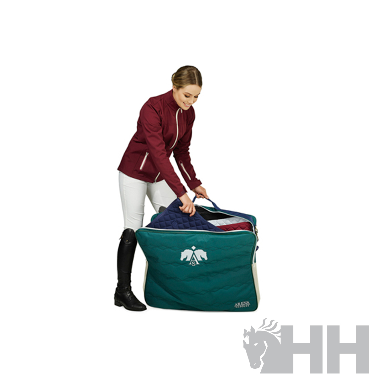Finalmente, una bolsa para mantilla diseñada con una malla transpirable para permitir que la tela se airee, y una base impermeable con una cremallera grande para guardarla fácilmente. A los jinetes les encantará esta bolsa imprescindible en la que caben hasta seis mantillas de tamaño completo para un fin de semana completo de entrenamiento o competición. Con una correa larga cruzada para facilitar el transporte.