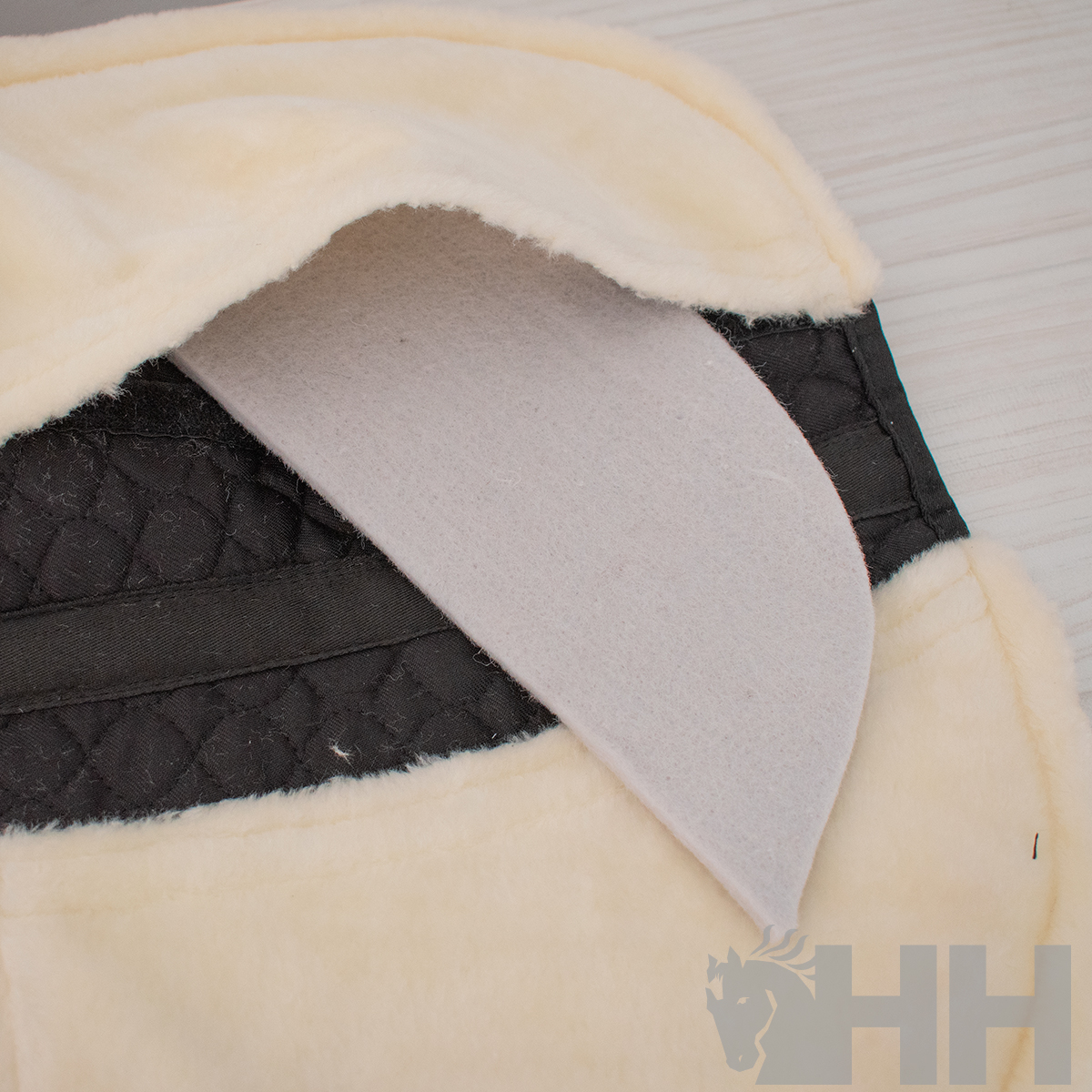 Salvacruz de algodón realizado con borreguillo sintético y cuñas o rellenos de fieltro. Dispone de bolsillas interiores (delanteros y traseros) con cierre de velcro para poder colocar rellenos de fieltro y poder equilibrar la silla sobre el caballo.
