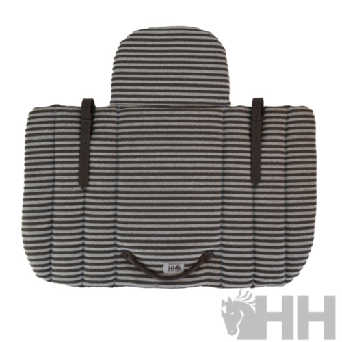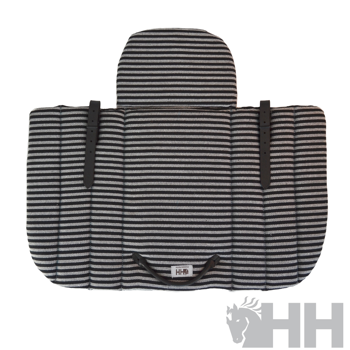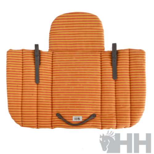 Acolchada y realizada con la tradicional lona utilizada en la doma vaquera. Asa y correas de fijación realizadas en cuero.