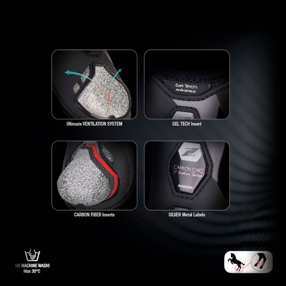 De hecho, el inserto especial de Fibra de Carbono (patentado y, por primera vez, brillante) mejora la capacidad protectora del protector manteniendo la máxima flexibilidad y adaptabilidad a las extremidades del caballo.