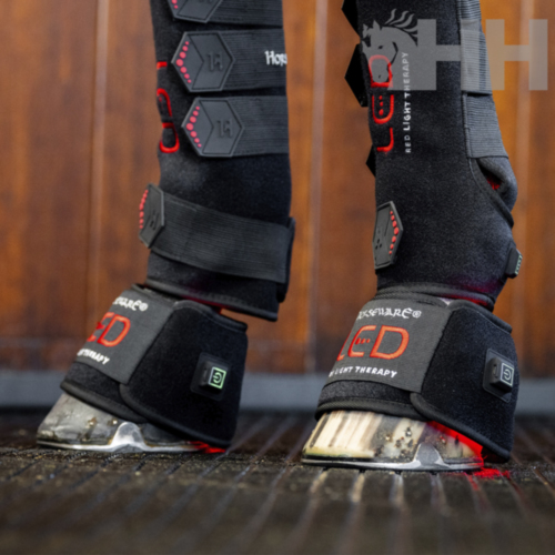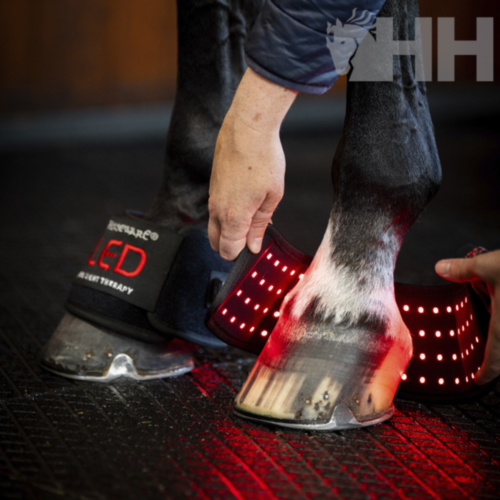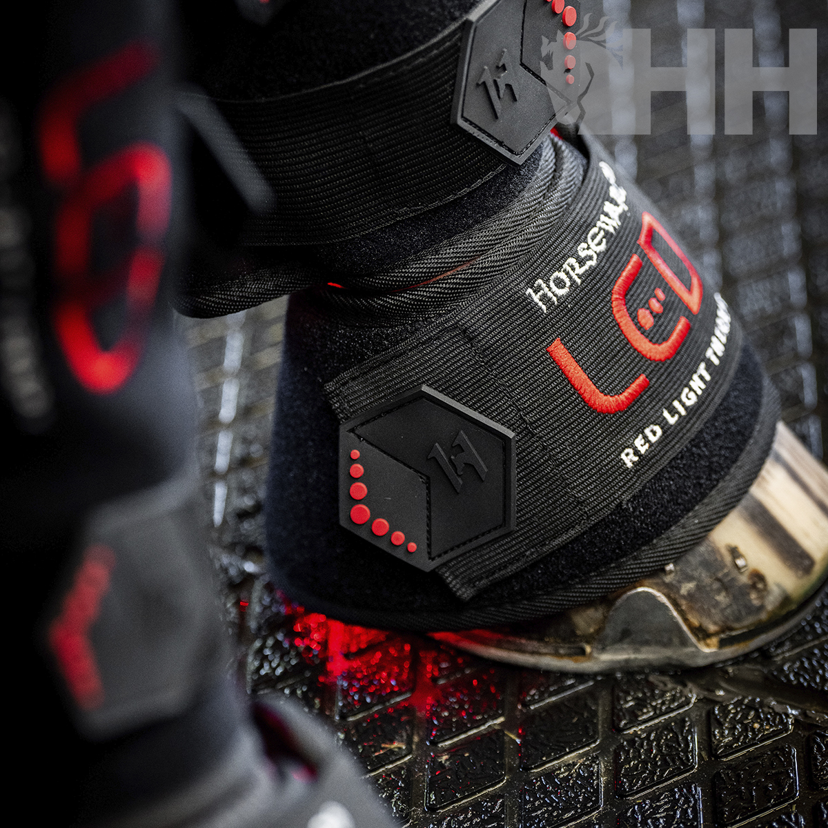 La versátil campana de terapia de luz roja LED Horseware® se puede usar en múltiples zonas, incluyendo cascos, cuartillas, rodillas y menudillos. Sus 80 LED combinan diferentes longitudes de onda para dirigirse tanto a la capa dérmica como a los tejidos profundos. La luz roja de 660 nm se enfoca en la superficie, mientras que la luz infrarroja de 850 nm penetra más profundamente para alcanzar los tejidos blandos.