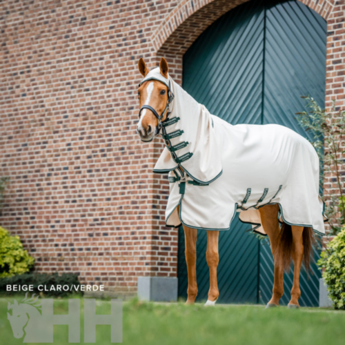 Muy resistente y duradera al estar fabricado con un tejido poliéster 1000D. Aísla perfectamente de cualquier tipo de insecto incluso los más pequeños ya que su trama es realmente pequeña pero muy transpirable. Ofrece protección 100% frente a los rayos UV. Todo ello acompañada de un gran confort y suavidad a la piel del caballo.