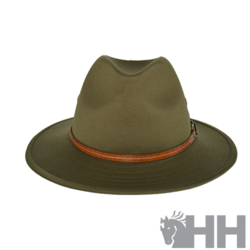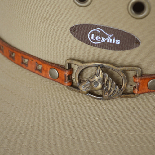 Elegante sombrero realizado en loneta de algódón con detalle de cuero auténtico y figura cabeza caballo.