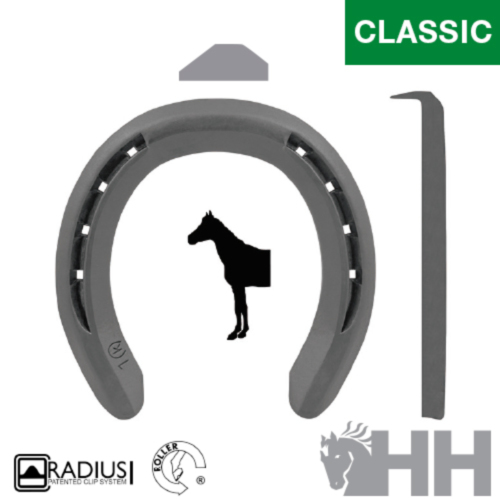 Con sistema RADIUS. En este sistema las pestañas se sitúan fuera del área de la herraduras. Las pestañas se añaden a la herradura y por tanto no se merma la superficie de apoyo de la herradura. En este caso el casco no debe ser retocado en sus paredes para adaptarlo a las pestañas de la herradura. Con diseño ROLL-OVER.