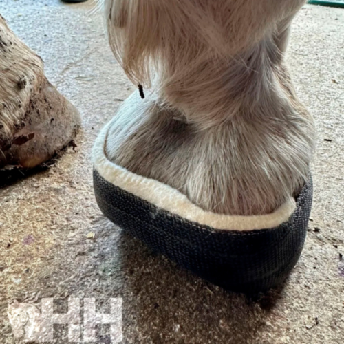3.- Comienza a colocar la malla con una ligera superposición en la suela. Evita cubrir el borde coronario y los bulbos del talón. La mayoria de los cascos no necesitan un rollo completo, a menos que se desee un grosor adicional.