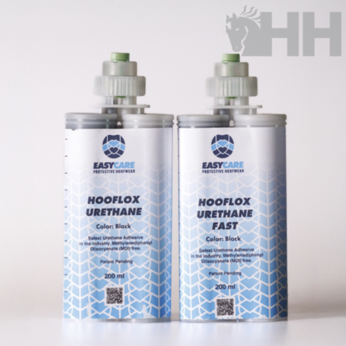 Adhesivo de poliuretano de dos componentes (200 ml). Compatible con las EasyShoes tipo manguito. Gran capacidad de relleno de huecos de hasta 10 mm. Hooflox Urethane es la única fórmula de uretano del mercado con menos del 0,1 % de MDI. Esto lo convierte en el pegamento de uretano más seguro y fácil de usar del mercado, tanto para herradores como para animales.