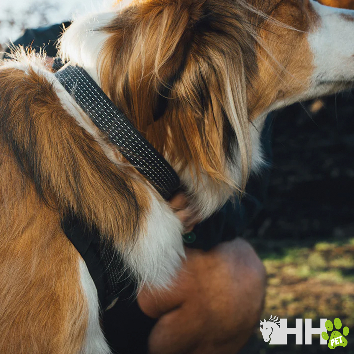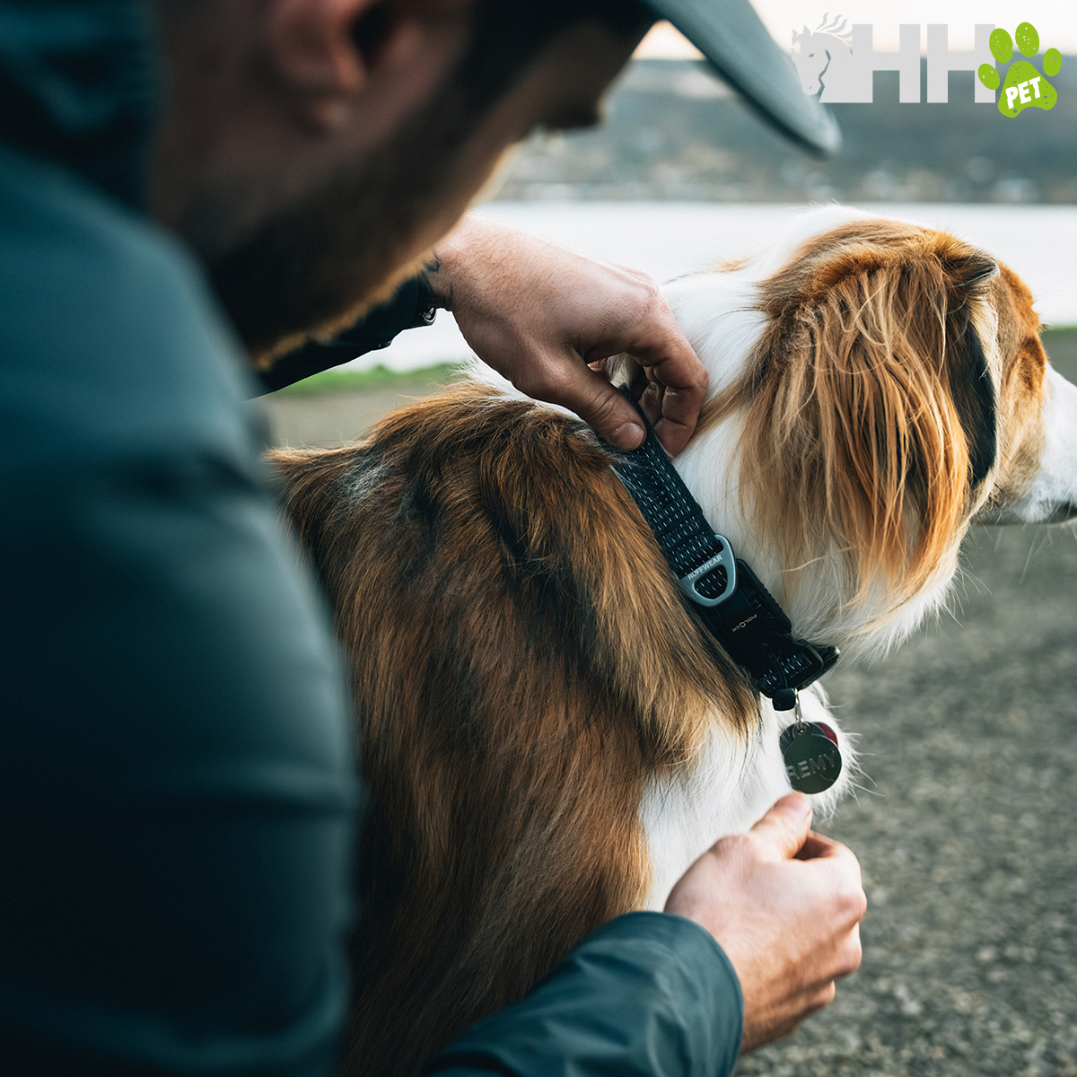 Una anilla en V de aluminio proporciona un punto de sujeción seguro para la correa, una placa de identificación independiente se puede ajustar para colocarla en el lugar ideal y un silenciador de silicona reduce el ruido de la placa de identificación de la mascota».