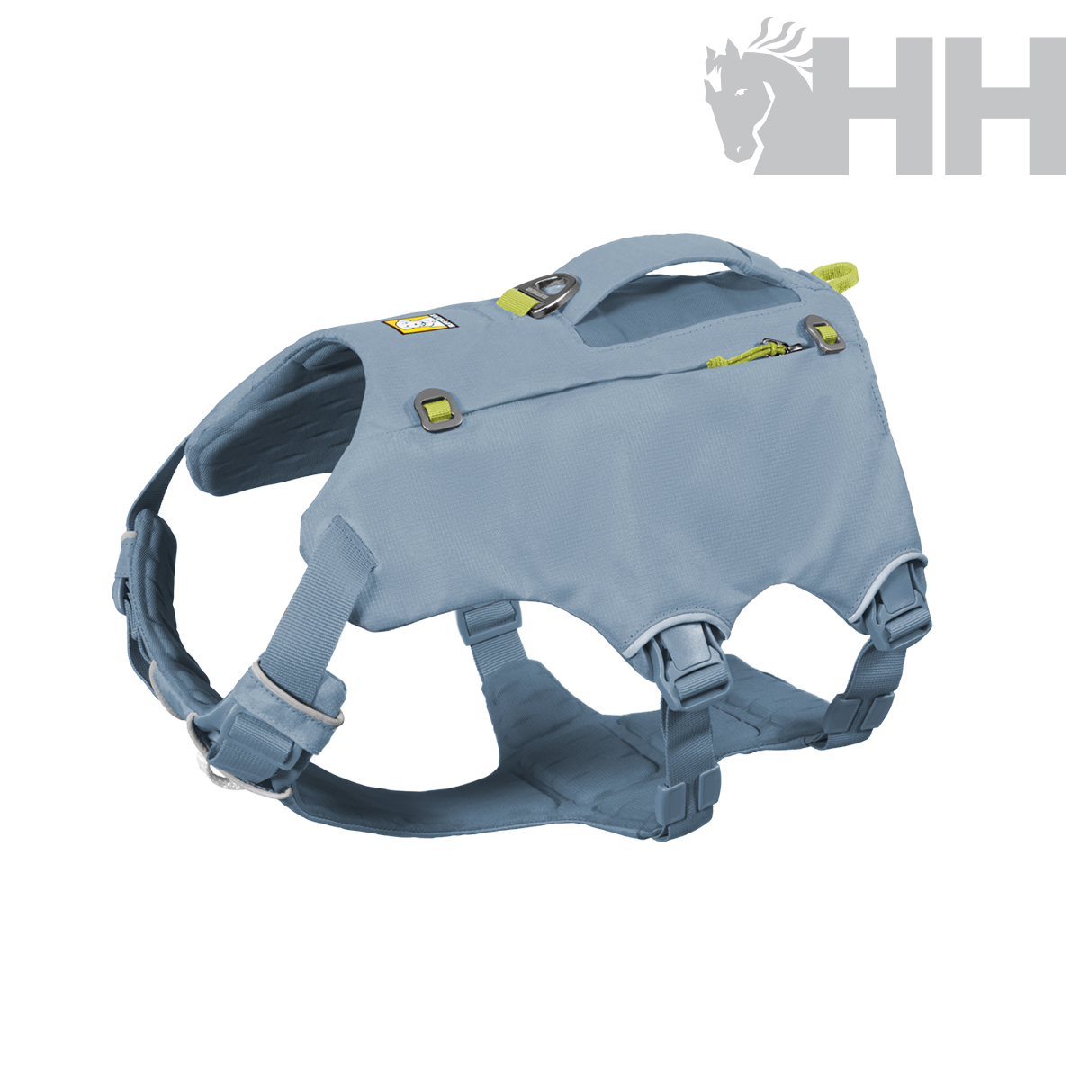 • Tres puntos de sujeción para la correa: anilla en V de aluminio y bucle de cinta reforzada en la espalda, con un bucle de cinta adicional en el pecho para redirigir a los perros que tiran de la correa.