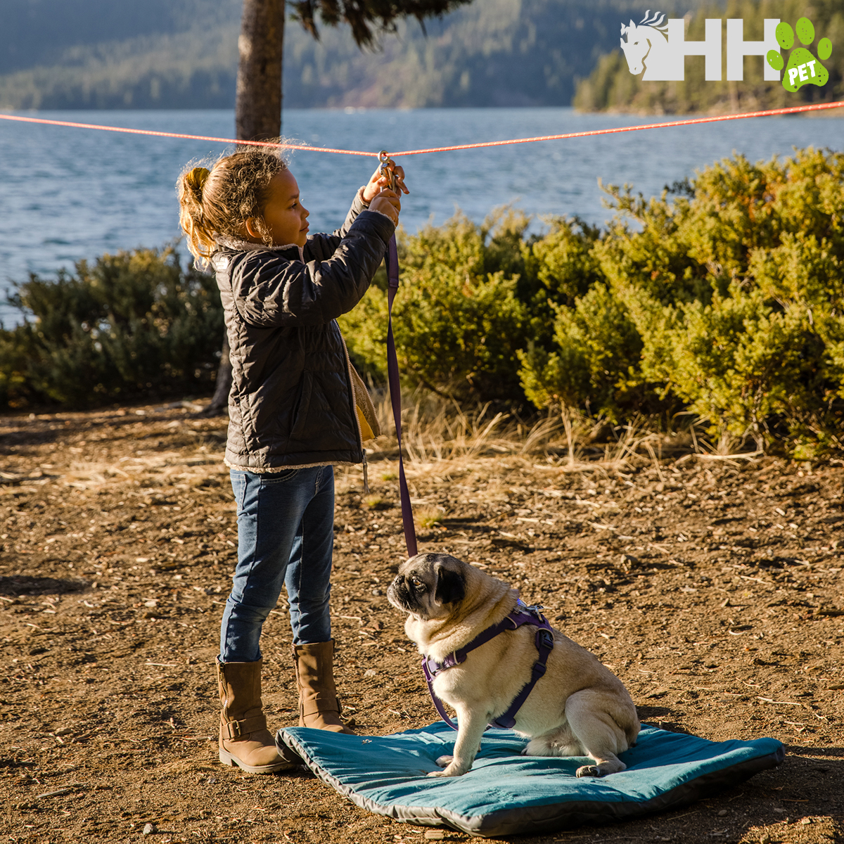 El Knot-a-Hitch incluye una fuerte cuerda kernmantle que se puede instalar entre dos árboles o asegurar a un solo poste usando herrajes diseñados por Ruffwear y un sistema tensor fácil de usar. Su perro puede explorar su nuevo entorno mientras usted realiza las tareas del campamento, como montar la tienda, preparar la cena o encender una fogata.