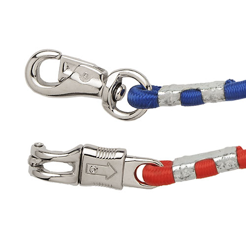 Realizado con goma elástica forrada muy resistente, diámetro 14 mm. Dispone de una mosquetón gatillo muy resistente en un extremo para unir al remolque y otro antipánico en el otro extremo para unir al caballo.