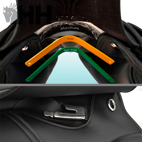 - Sistema muy sencillo de intercambio de puentes para poder adaptar la silla a la morfología de cualquier caballo. La silla incorpora de serie el puente negro de 30 cm pero se pueden adquirir por separado puentes de 32 y 34 cm respectivamente.
